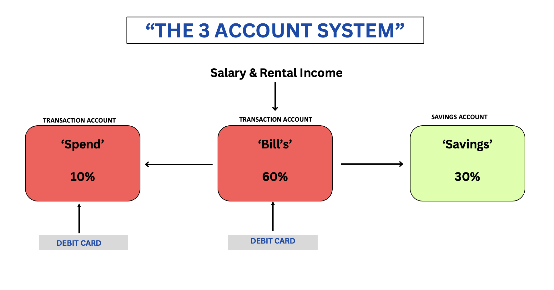 You bank 100% of your salary plus income rental properties goes into your Bills account. If you are self-employed this would be a fixed monthly drawing you make from your business account into your Bills account.