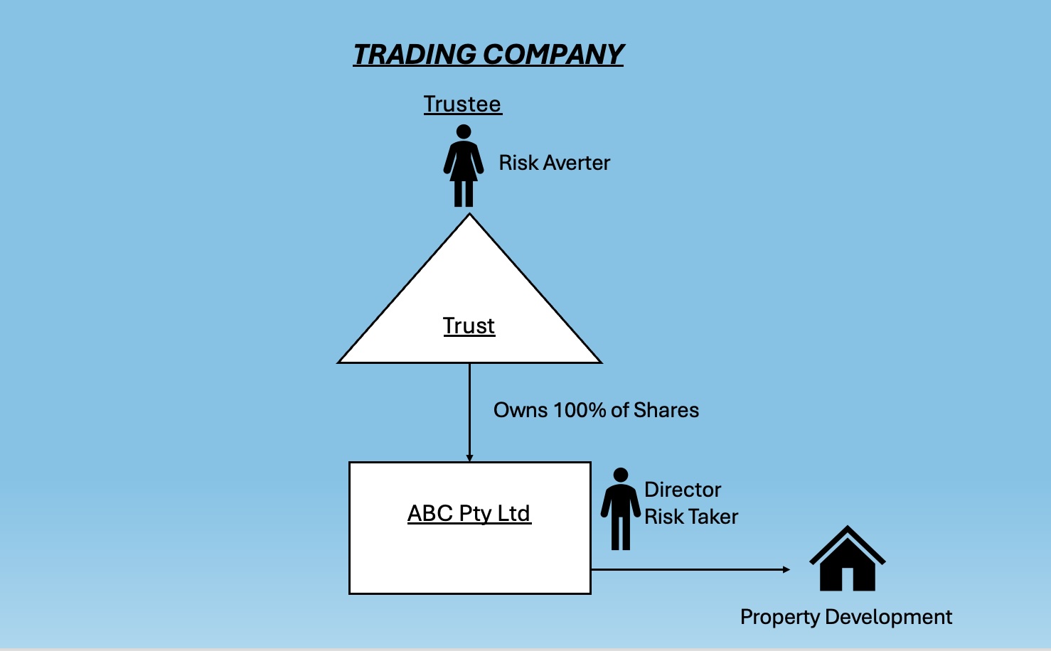 The Company buys the site, builds the project and sells the finished properties. That’s where the risk sits. At the same time, Tom, as the risk taker, is the director the Company. He runs the projects, makes the decisions and deals with the banks and builders. He controls the business, but he doesn’t personally own the assets that need protecting. Sarah, as the risk averter, sits at the top as the trustee of the family trust.