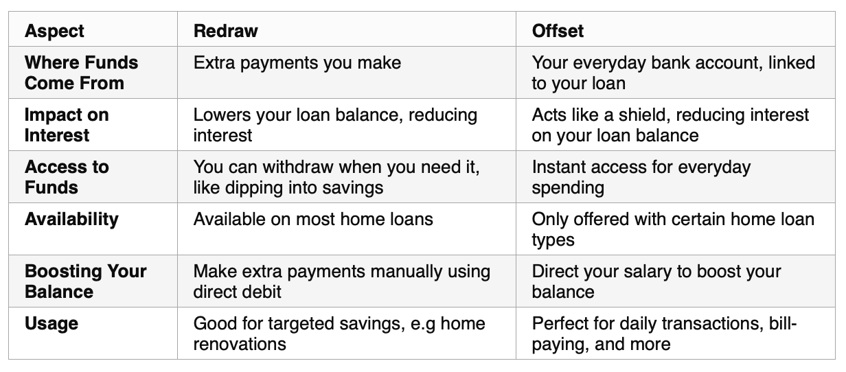 The big difference is how they handle your money. With redraw, your extra payments go into your loan balance. But with offset, your money sits in a separate account, doing its thing.