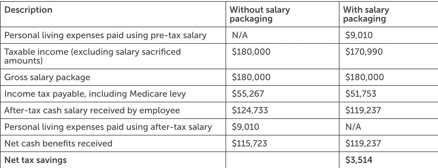 As you can see from the example provided earlier, when an employee sets up a salary sacrifice arrangement where their employer pays for their living expenses totaling $9,010 using pre-tax salary, the employee ends up benefiting by an extra $3,514 thanks to the tax savings.