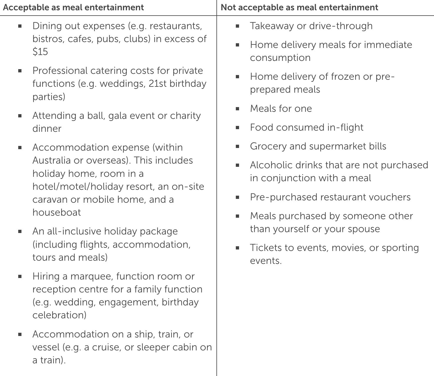 To give you a clearer idea, here's a table that provides examples of meal entertainment items that can and cannot be included in your salary packaging: