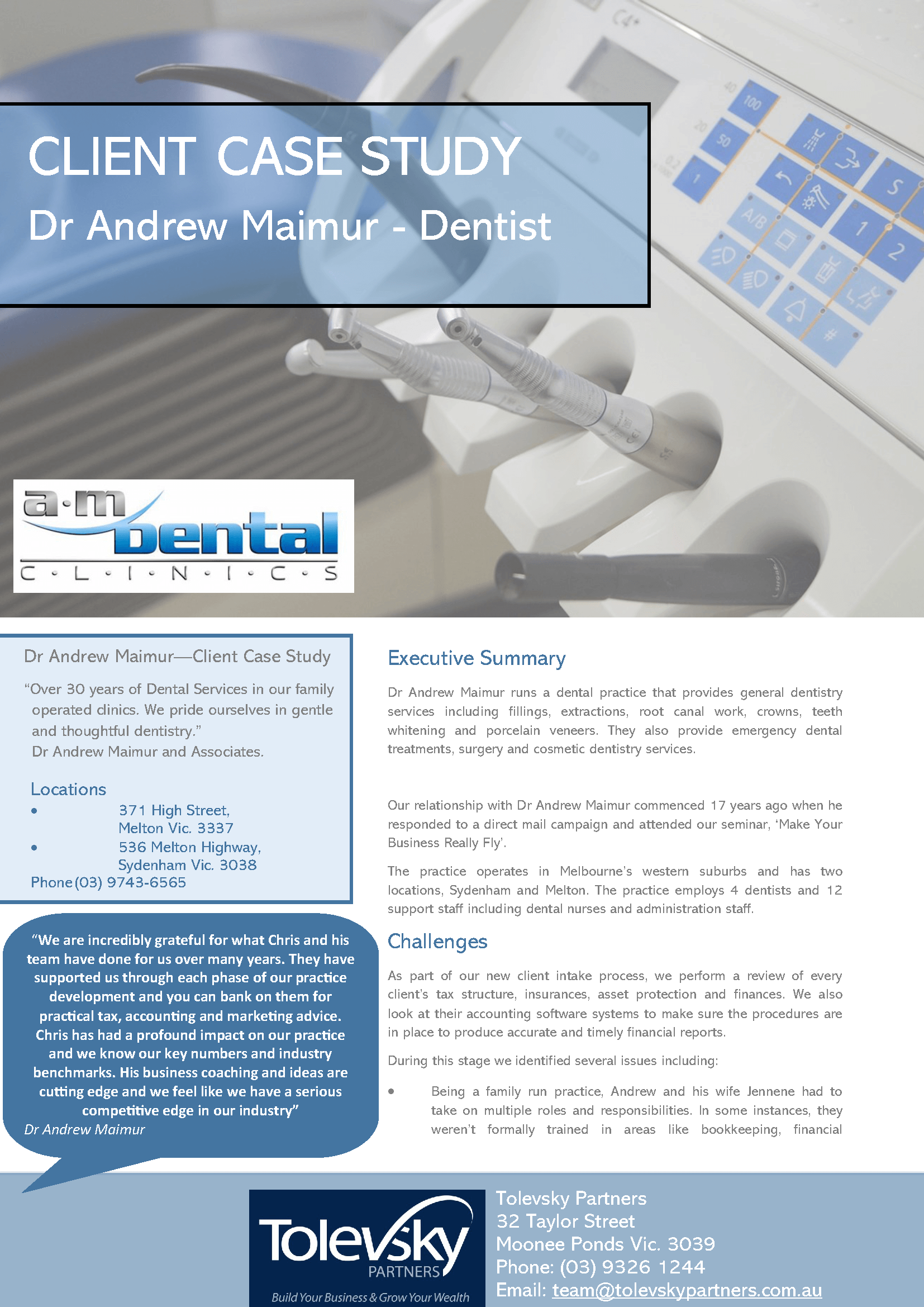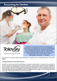 Running a dental practice is very demanding. You have to deal with public health issues and stringent industry regulations not to mention patients who fear the drill and sometimes the 'pain' of the bill. The profession also presents challenges like staff retention, mounting accounts receivable and of course, technological advancements. Pardon the pun, but some days running the practice is a bit like 'pulling teeth'.Over the past decade Chris Tolevsky and his team of accountants have mentored a number of dentists and allied oral healthcare professionals through the various stages of their business life cycle, from start up right through to sale. He has first hand experience with cavities and extractions and says the accounting and dental profession have a lot in common. "We both deal with the public and in many cases handle the needs of generations of families. The parallels don't stop there as we both heavily rely on referrals for growth and trust is a key ingredient for success".