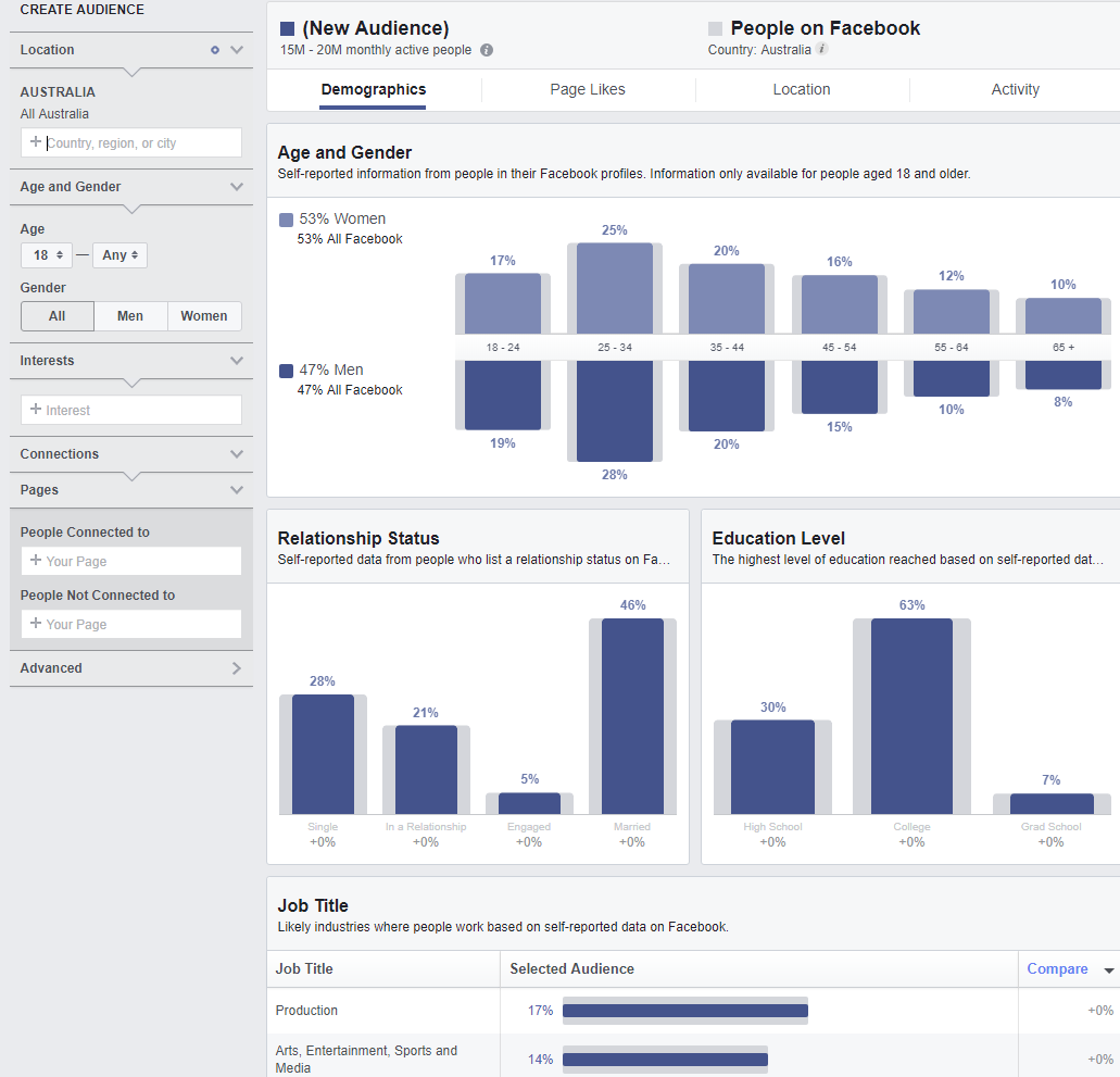 Audience Insights gives you an opportunity to learn more about your specific audience by selecting the option of choosing 'People Connected to your Page'. Note, you need to have enough page likes to access information including the age and gender, relationship status, education level and job title (industries). In addition, you can access top categories which is what other type of pages your audience reacts to and what Facebook pages are likely to be relevant to your audience based on their previous likes. This information can be useful in terms of where to pitch the tone of your Facebook advertising and posts based on their industry or job title.